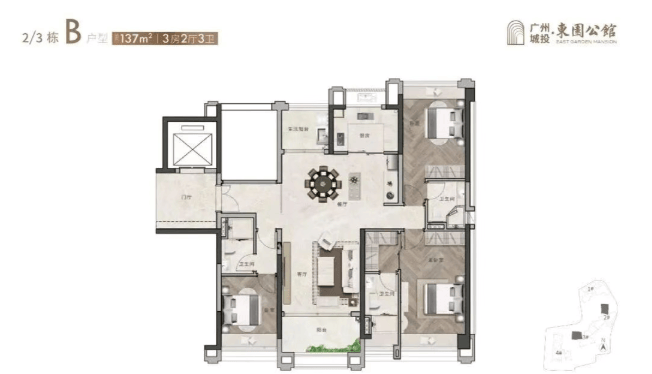广州城投·东园公馆坐落于广州市越秀区,占地面积8470平方米,建筑面积达84229平方米,容积率为5.8,绿化率达到30%。该项目由广州城投集团开发,包括4栋住宅楼(其中1栋为回迁房),总层数在21至23层之间,共提供249户住宅单位。