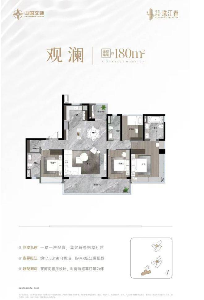 户型结构:一梯一户设计,南北双阳台,9米超长观江面,双主卧套房(均带独立卫浴+步入式衣帽间),中西双厨布局。