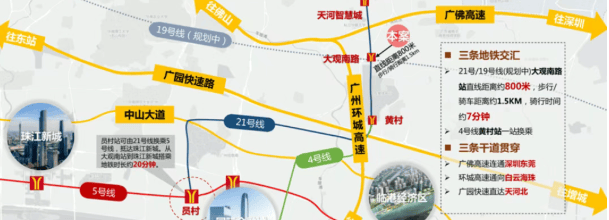 交通是决定资产价值的关键要素。东基·天河阳光距地铁21号线大观南路站仅约800米,步行可达。搭乘21号线,3站直达员村,4站即抵珠江新城——广州无可争议的CBD核心。此外,项目周边还覆盖4号线黄村站,并规划有19号线(建设中),形成三地铁交汇之势,未来出行将更加便捷。