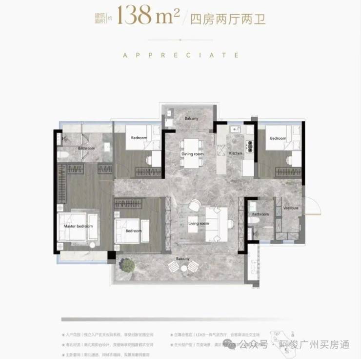 在户型设计上,越秀万博和臻精益求精,融入多项人性化细节,打造舒适、实用的居住空间。多数户型采用 LDKB 一体化设计,将客厅、餐厅、厨房、阳台打通,形成超大尺度的公共活动空间,不仅提升了空间的通透感与采光性,更增强了家人之间的互动与交流;部分户型搭配约 8.65 米阔景阳台,主卧配备 270 度 L 型南向飘窗与步入式衣帽间,营造出奢阔的居住体验与尊崇感。同时,户型均做到动静分区、干湿分离,保障居住的私密性与舒适度,细节之处尽显匠心。