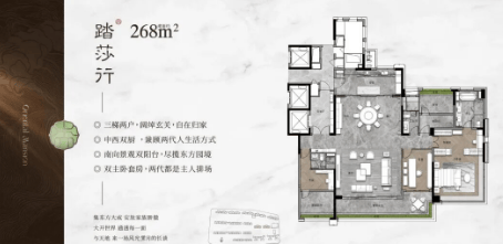 268平方米户型:五房两厅四卫,3T2户设计,配备保姆电梯,双主套互不干扰,LDKG大方厅设计,适合大家庭居住。