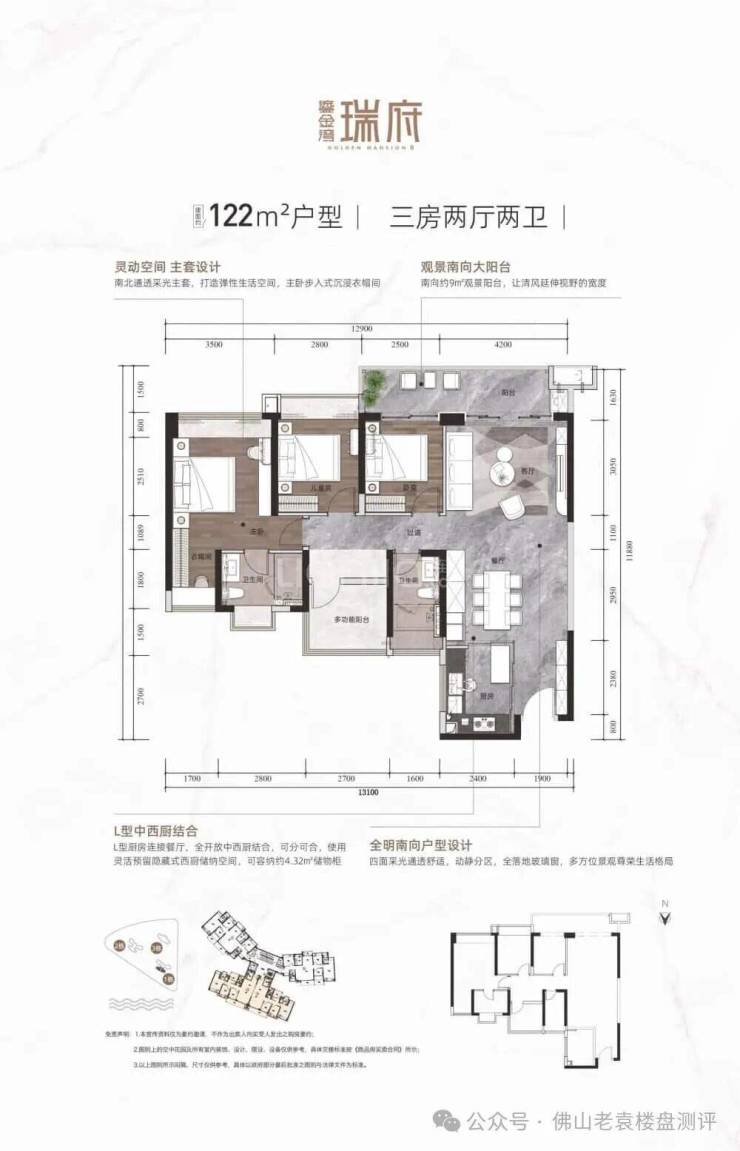122㎡户型:入门级改善户型,竖厅动静分区,四开间朝南,约6.8米南向双联观景阳台,主卧带270°全景飘窗,实得面积堪比市面140㎡户型。