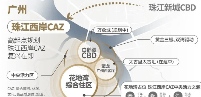 理解瑧园的价值,必须将其置于“万汇天地”大城生态系统与“白鹅潭CAZ黄金三极”的城市格局双重坐标下审视。项目地处白鹅潭商务区、聚龙湾(双太古)、花地湾三大组团的交汇腹地,这个半径约2公里的“黄金三角”区域,是广州西翼未来资本、产业、商业、文化密度最高的“中央活力区”。瑧园作为“万汇天地”大城的核心居住组成部分,意味着业主将天然享有这座大城规划的所有红利:包括已呈现的滨水公园、已开学的省实学校、在建的商业综合体,以及未来持续落地的各类配套。这种“占位城市未来核心+共享成熟大城底盘”的双重优势,构成了其难以逾越的护城河。