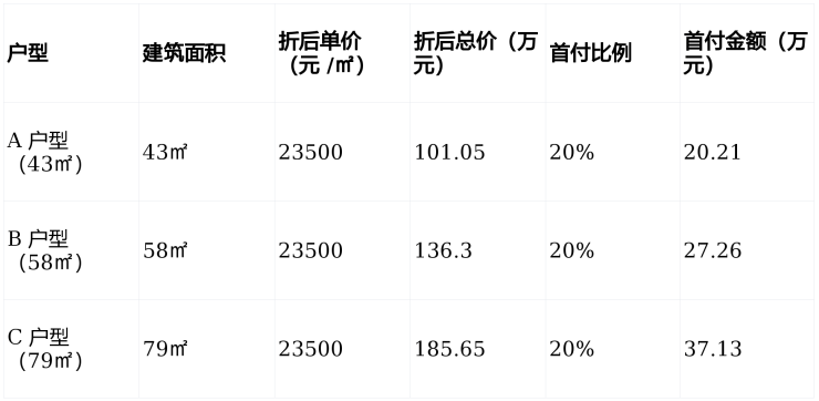 科城・海纳芯主推 43㎡、58㎡、79㎡三种核心户型,结合 20% 商业地产首付比例与折后均价,首付金额如下: