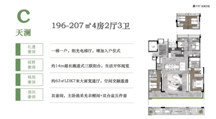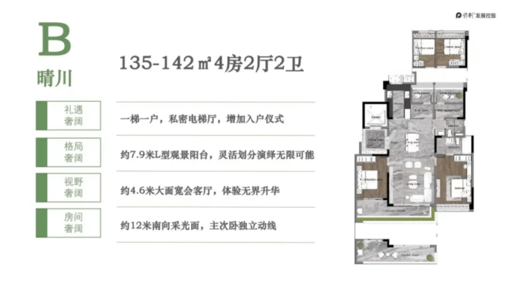 目前在售户型均为四房设计,全部是现楼实景呈现,覆盖刚需改善到终极改善的全需求。其中103-131㎡四房两厅两卫是入门级改善户型,总价650-835万,采用LDK客餐厨一体化设计,做饭时能随时照看客厅的孩子,家人互动更便捷。搭配约7米双联观景阳台,把窗外的绿意和光线都引入室内,户型方正没有浪费空间,得房率不错,而且户户朝南,每天都能拥有充足的采光,很适合三口之家或刚改家庭。