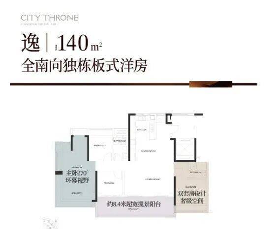 140㎡双主套四房:一梯一户+独立玄关,南向约8.4米揽景阳台,主卧270°超广角视野。