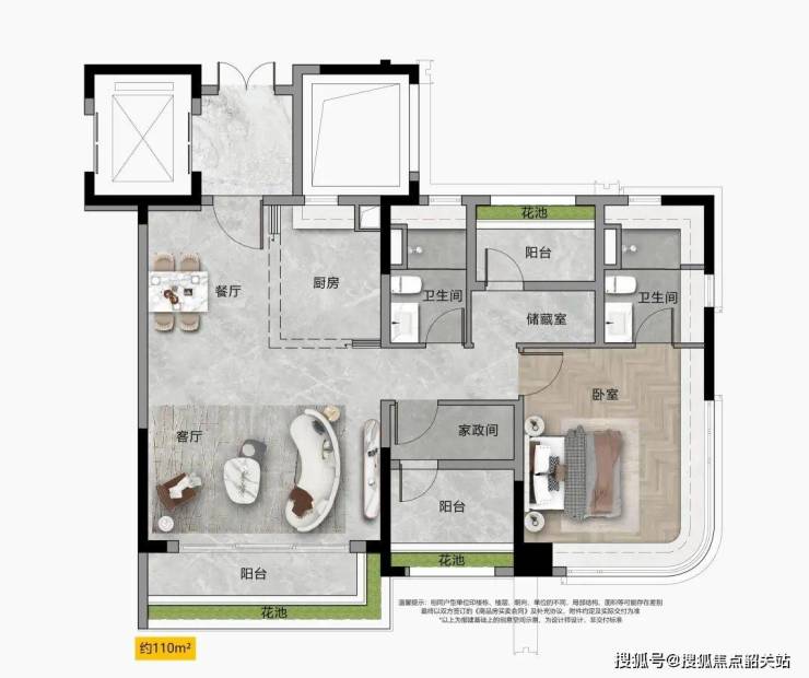 108㎡户型:实测得房率92%,最大约4.9米开间大方厅,主卧配备270°转角飘窗,全屋采光面达12米,实现“小户型大平层”体验。