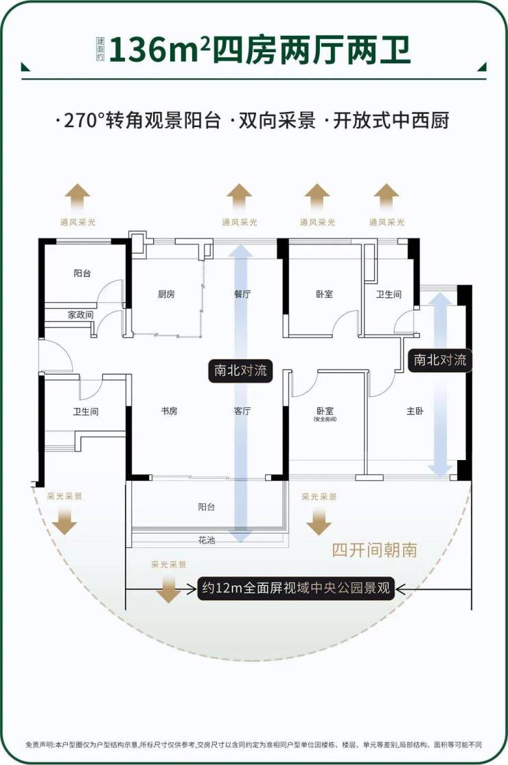 140㎡四房两厅三卫:改善主力户型,得房率86%,南北对流,四开间朝公园,景观视野极佳。客厅开间约5米,搭配全景落地窗,最大化引入公园景观;主卧配备独立卫浴、衣帽间与飘窗,私密度高,空间阔绰;配备独立书房,可满足办公、学习需求,适合注重生活品质的改善家庭。