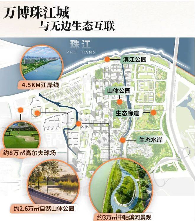 项目的核心占位价值,已获得城市顶级规划的背书。它雄踞于广州官方定性的“世界级地标商圈”——长隆万博商务区的核心延展带。随着万博CBD从1.5平方公里扩容至7.2平方公里,规模已超越珠江新城,这里汇聚了思科、欢聚时代、希音等近3万家高新企业,总投资超700亿元。更为难得的是,在如此高强度的商务区中,项目占据了稀缺的南向滨江地带,独享约4.5公里江岸线,与对岸的约8万平方米江山高尔夫球场隔江相望。这种“世界级商圈核心+绝版生态江岸”的双重顶级资源占有,使其成为万博板块乃至广州南部罕见的、能同时满足塔尖事业追求与诗意栖居理想的“封面作品”。