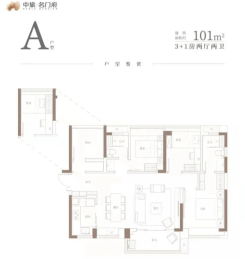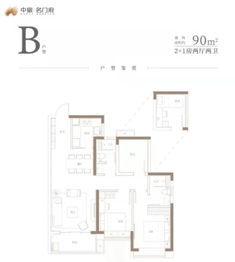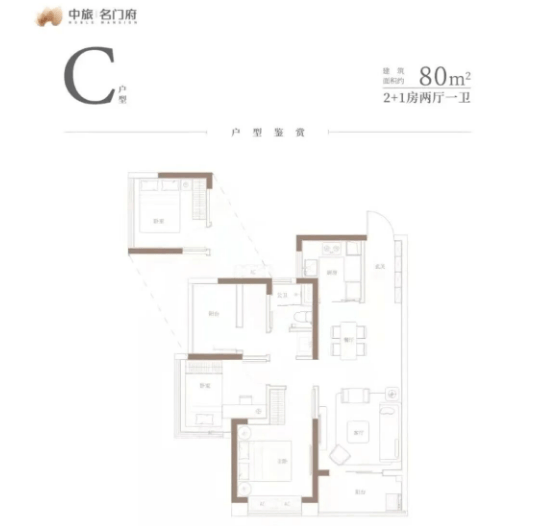 C户型:建面约80平方米,2+1房两厅一卫,小而精致,适合年轻家庭或单身人士。