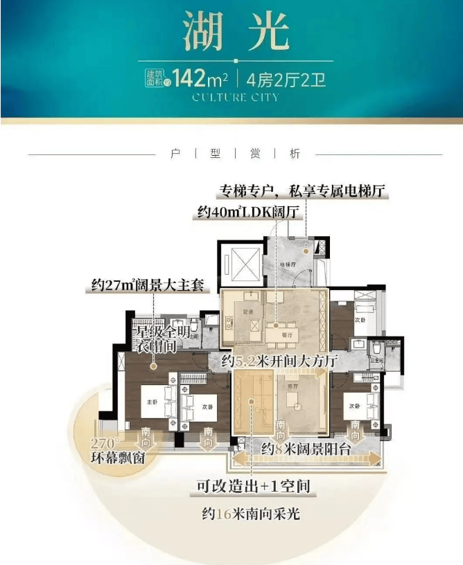 户型亮点:约18米南向IMAX湖景风光,全屋南北对流设计,穿堂风自由畅通;南向全景阳台面积近16㎡,约8米巨幕观景面,可打造品茗区、休闲区,推窗见湖、瞰江,景观极佳。