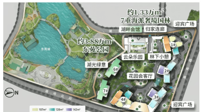 园林景观设计:项目拿出超1/2土地打造7重海派奢境园林,内外生态空间连接,形成约6.4万方CBD湖居景观,搭配东苑公园约1.2万方荷花湖景,打造推窗见景的居住体验,园林内种植名贵绿植,一步一景。