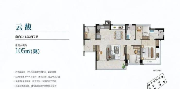 建面约106平方米四房:实现了主流面积段的四房功能飞跃,多开间朝南,客厅开间宽阔,满足多孩家庭或需要独立书房、客房家庭的升级需求。