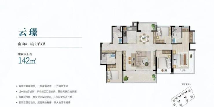 建面约142平方米五房:旗舰级产品,在约142平方米内规划出五房空间,拥有多套房设计及超大景观阳台,为多代同堂的大家庭或追求极致空间体验的客户提供了顶级选择。