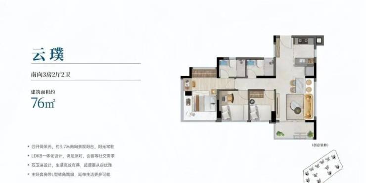 建面约76平方米三房:在紧凑面积内实现标准三房功能,全南向设计,空间布局紧凑高效,是高实用率典范,极大降低了上车门槛。