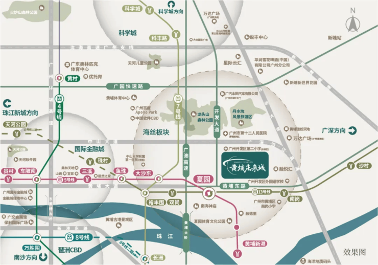 中交科城·黄埔未来城地处黄埔将军山板块,地理位置优越,交通网络四通八达,既能享受老城区成熟配套,又能搭乘板块发展红利。项目南部临近地铁5号线与13号线交汇的夏园地铁站,步行可达,一轨直达珠江新城、金融城等核心商圈,无需换乘,极大节省通勤时间。