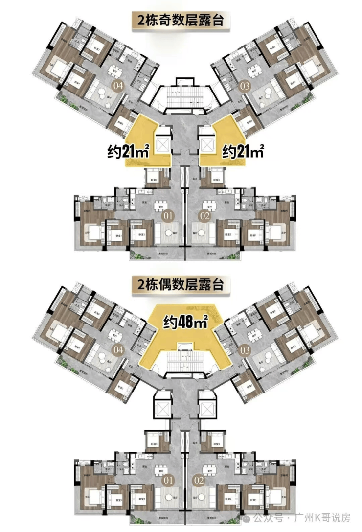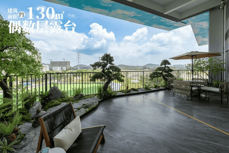 项目依托广州住宅新规优势,鼓励提高住宅阳台面积占比,半开敞空间按水平投影面积一半计容,主景观阳台满足条件可不限进深,叠加各项政策buff后,实用率最高可达143%,部分户型实用率超130%,秒杀周边竞品(黄埔新城得房率仅90%左右)。偶数层标配约60平超大空中庭院,每层空中庭院错位挑出,净高可达6-6.3米(塔楼6米,板楼6.3米),实现“一户一庭院”的居住梦想。