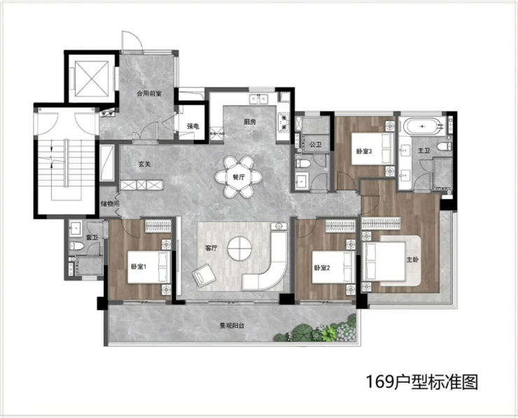 建面约165㎡板楼户型:专梯入户设计,配备4个阳台,空间灵动多变;空中庭院尺度优越,可满足晾晒、观景、种植等多重需求,打造专属私密空间;纯板式结构保证南北通透,极致采光通风,居住体验堪比别墅。