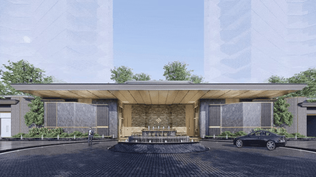 社区配套对标星级酒店标准,打造极具仪式感的归家路径。社区入口处设有7.7米高的灿金门头,搭配典雅黑灰奢石墙面、酒店式环岛落客区及唯美水景,彰显尊贵身份;下沉会所的中庭水院景观灵动飘逸,复刻星级酒店高奢氛围,树影、水景与自然光交合,营造“归家即度假”的生活体验。