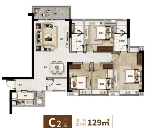 129㎡四房户型则主要面向改善型家庭,户型布局方正,空间利用率高。四个卧室能够充分满足多人口家庭的居住需求,同时还可根据家庭需求改造成书房、儿童游乐室等功能空间,提升了空间的灵活性。客厅宽敞明亮,连接景观阳台,能够欣赏到小区内部的园林美景;餐厅紧邻厨房,方便食材传递和用餐。