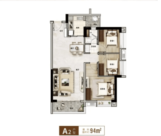 93㎡三房户型是项目的刚需主力户型,空间布局紧凑合理,没有浪费面积。客厅连接阳台,增加了空间的通透感,也为业主提供了良好的采光和通风条件。三个卧室尺寸适中,能够满足家庭成员的居住需求,其中主卧带有独立卫生间,保障了业主的私密性。厨房采用L型设计,操作空间充足,方便业主日常烹饪。