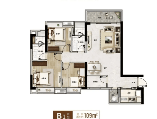 109㎡三房户型空间更加宽敞,客厅和餐厅相连,形成了开阔的公共活动空间,适合家庭聚会、休闲娱乐。卧室面积相较于93㎡户型更大,居住舒适度更高。阳台面积适中,能够满足业主晾晒、休闲等多种需求。