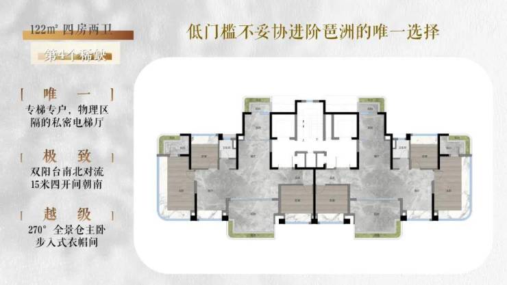 梯户比:全盘采用2梯2户专梯专户设计,电梯门开启即达专属电梯厅;