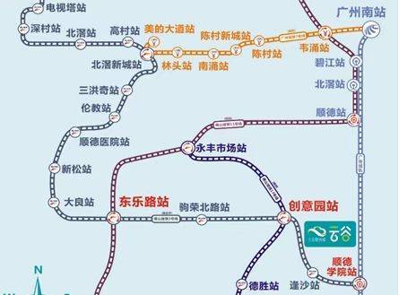 广珠城轨双站点(顺德站、顺德学院站),10站可达广州南站。