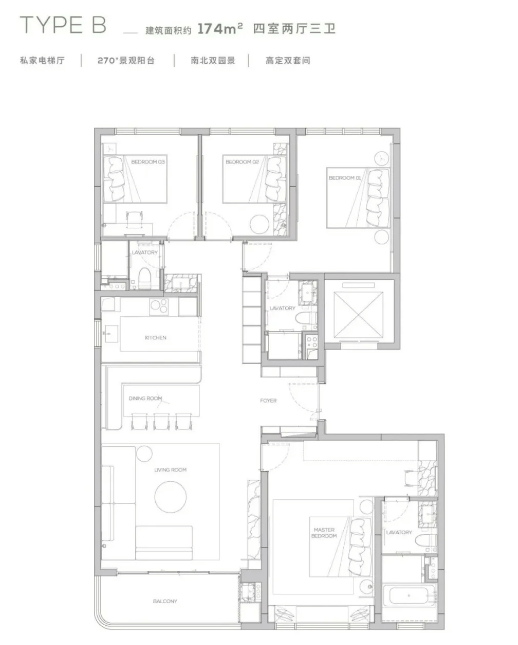 项目主推 145-315㎡四至六房,聚焦高端改善需求,空间设计兼具舒适度与仪式感。145-174㎡四房为入门款,2 梯 2 户专梯专户,南北对流,部分户型带 270° 环幕阳台,主卧套间配备独立卫浴与步入式衣帽间,适配三口之家向多代同堂过渡;190-230㎡五房为明星户型,巨幕宽厅 + 双主卧套房,预留家政空间与储藏室,满足高净值家庭对空间功能性的高阶需求;260-315㎡六房为顶改旗舰款,现房在售,大尺度社交空间 + 全景望湖视野,部分户型配备独立书房、私宴厅,适合家族式居住,全户型均以 “大面宽、多套房、强收纳” 为核心,贴合高端圈层对居住品质的极致追求。