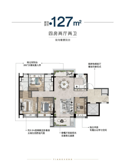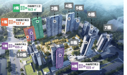 振业天成在户型设计上主打改善型需求,主推建面约 104 - 168㎡全四房户型,两梯两户或两梯三户设计。这种低梯户比的设计营造了更强的隐私感,同时豪宅级标准的舒适度、低公摊使得空间更实用,高效出行,杜绝 “等梯烦恼”。项目采用超常规的围合式布局升级版,将楼栋均放置在边缘,不仅将原规划的 18 栋住宅降低至 10 栋,仅服务于 689 户居民,使得每栋平均住户不到 58 户,而且小区建筑密度仅 19.50%,2.0 容积率,领先广州 94% 的楼盘,楼间距约 200 米,真正实现户户瞰景,为业主提供了宽敞舒适的居住空间。