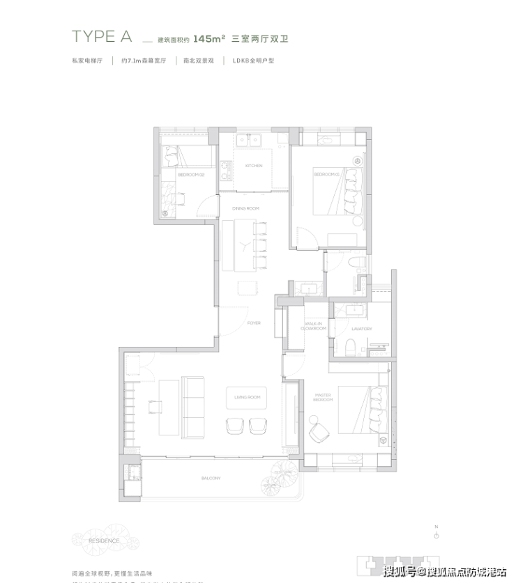145㎡三房两厅两卫:独享私家电梯厅,约7.2米森幕宽厅,LDKB全明户型设计,灵活切换生活场景。