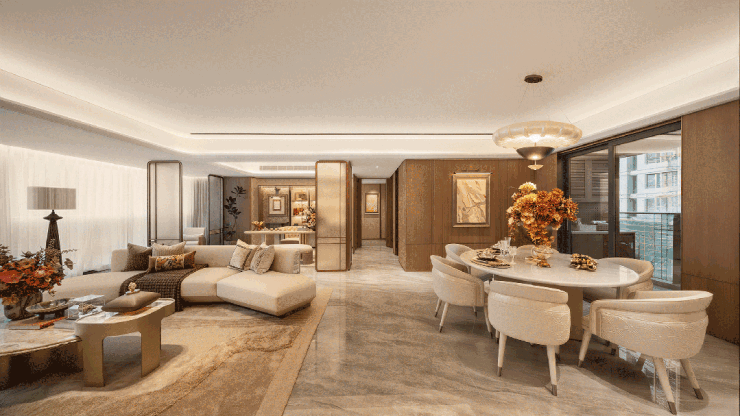 项目主力户型为建面约139㎡、168㎡四房产品,户型实用率突破106%,空间利用率远超常规住宅产品,是项目核心产品优势之一。建面约139㎡四房户型,打造四开间朝南格局,搭配约8米跑道式双阳台,室内采光面充足,南北通透效果优异;客厅面积约54㎡,采用LDKG一体化设计,打通客厅、餐厅、厨房与阳台空间,形成开放式家庭互动核心区;主卧配备270°环幕飘窗,视野开阔,同时规划男女双衣帽区,提升收纳空间与居住舒适度;户型实现卧室平权设计,最小卧室面积约10㎡,可满足儿童房、书房、客房等多元功能需求,无空间浪费。建面约168㎡四房户型,规划内外双玄关,玄关面积约8㎡,兼具收纳功能与归家仪式感;客餐厅面积约44㎡,可拓展为约8.7米巨幕方厅,适配家庭聚会、休闲娱乐等场景;户型打造双南向套房设计,卧室分居公区两侧,保障家庭成员生活私密性;主卧采用270°观景设计,主卫标配双台盆、浴缸、智能马桶等设施,交标品质贴合改善需求。两款主力户型均优化阳台空间设计,阳台赠送面积约10-12㎡,进一步提升空间实用性,降低置业成本。