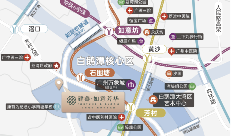 当广州城市发展逐渐由东向西布局时,白鹅潭作为新的国际化都市中心,承担着重要的增长使命。建鑫·如意芳华所在位置不仅连接白鹅潭总部经济区与西关城市文化资源,更处在荔湾区府周边,以天然的城市成熟度,构成不可替代的生活主场。其交通网络具备极高的结构优势,约600米即可到达地铁11号线石围塘站,依托环城轨道体系可直达珠江新城、琶洲、金融城等核心商务区,大幅提升通勤效率。而如意坊隧道、珠江大桥、洲头咀隧道等路网资源形成多维度快速通道,使得跨区流动更加顺畅。