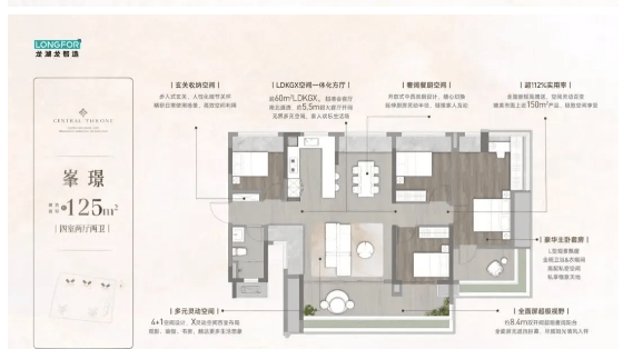 125㎡的峯璟户型更是“王炸”,堪称改善家庭的理想之选。横跨约12米的南向全景玻璃幕墙,就像一块巨幅落地窗,把江景和阳光都引进屋里。近60㎡的一体化LDKG+X无界方厅,是真正的“生活剧场”——妈妈在开放式中西双厨里做烘焙,孩子在客厅搭积木,爸爸在旁边的书桌办公,彼此看得见又不互相打扰。约8.4米的270°环幕阳台更是点睛之笔,摆上一套露营桌椅,早上看江景日出,晚上看城市灯火,氛围感直接拉满。