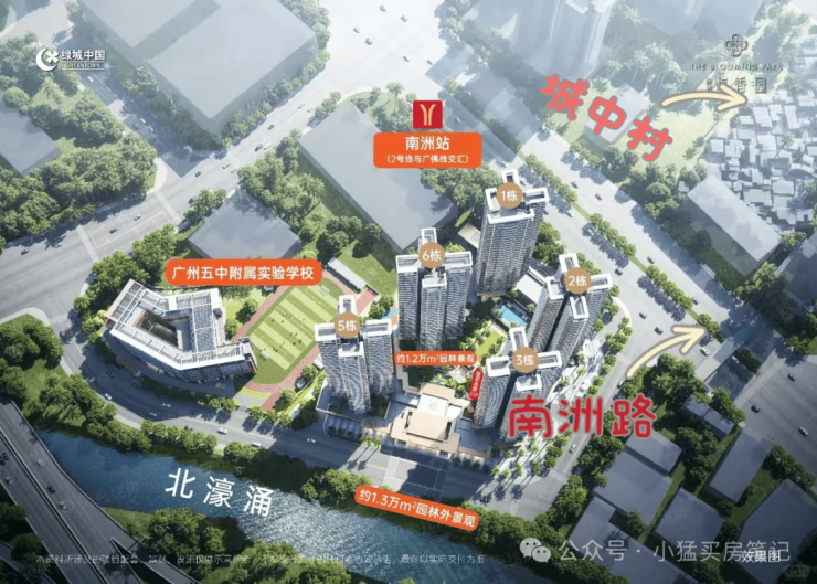 项目的基本参数勾勒出一个清晰画像:位于海珠区南洲板块,双地铁(2号线与广佛线)南洲站上盖,约100米距离堪称“无缝衔接”。小区配建五中附小(海珠学校),预计2026年9月开学,教育资源的确定性是其重要筹码。