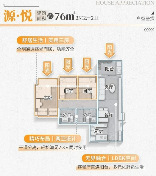 户型设计注重实用性与舒适性,如大横厅、大阳台的设计,提升了居住空间的宽敞感和自然光照度。