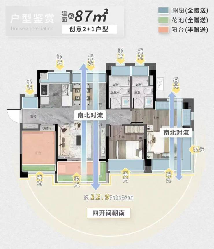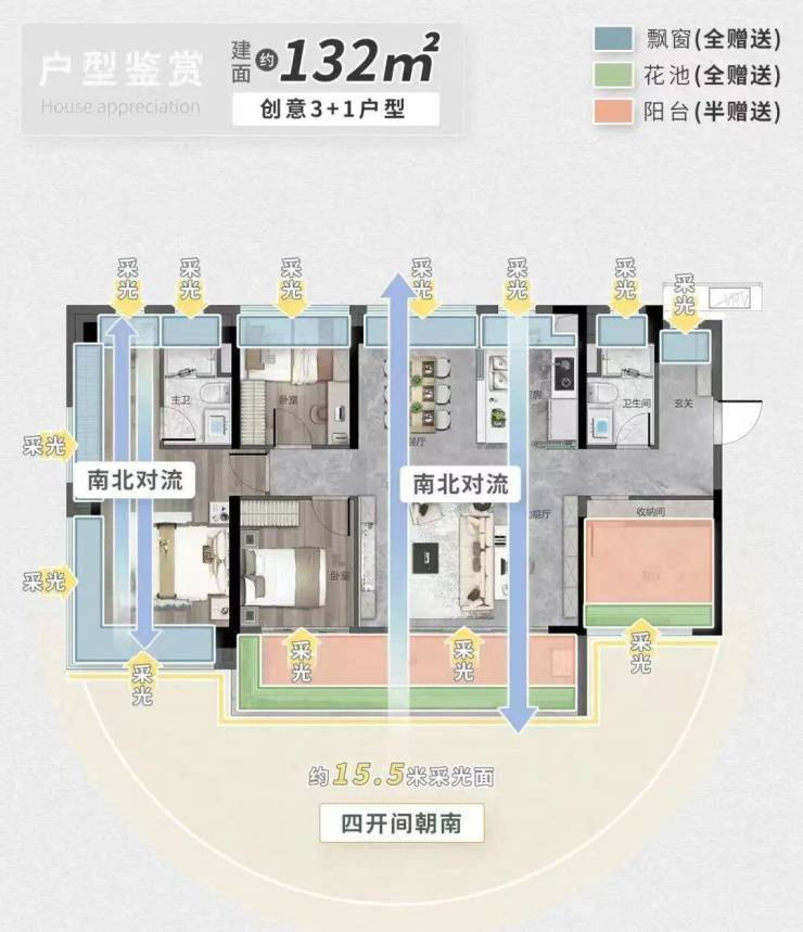 项目推出87-134㎡全南向户型,全部朝东南或西南,采光通风效果极佳,近110%的超高得房率,让每一寸空间都物尽其用。所有户型均采用LDKB一体化设计,打破空间壁垒,让家庭互动更加顺畅,全屋飘窗、人性化S墙、烟道外置等细节设计,更显居住用心。
