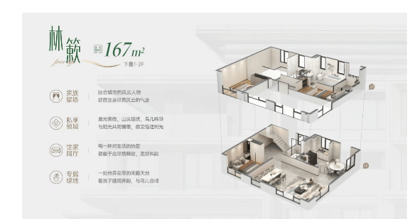 保利翔龙天汇主要推出的是建面约143-175平方米的城央山景叠墅,共计160套。户型种类多样,包括下叠(带地下室)、平层、上叠等多种形式,满足不同家庭结构的需求。例如,167平方米边户下叠赠送率高达300%,包含地下室和专属绿地,适合追求大面积私家花园的家庭;而149平方米顶楼大平层则赠送约30平方米露台,为喜爱空中花园的家庭提供了理想选择。所有户型均注重南向布局,确保充足的采光和开阔的视野,真正实现了“离尘不离城”的居住理念。