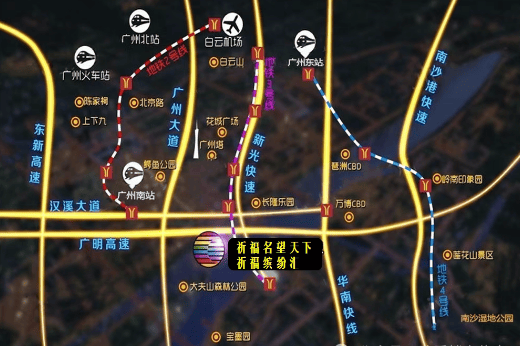 22 号线市广路站已开通,1 站到广州南站,2 站珠江新城(快线换乘),未来南延段建成可通达大湾区。自驾通过多条快速路畅达广州各区域。