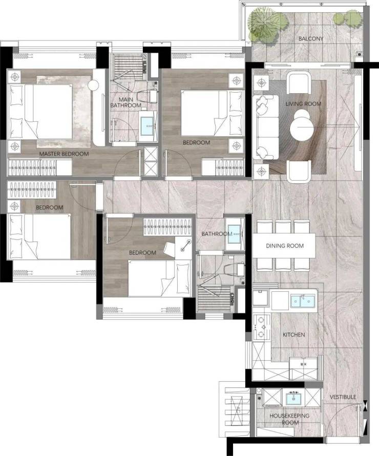 最为引人注目的是建面约180㎡的豪华四房三卫户型,这款产品堪称豪宅级别的居住体验。三个卫生间的配置彻底解决了早高峰的使用冲突问题,主套间更是集成了淋浴、浴缸、双台盆等高端卫浴设施。超大阳台的设计不仅拓展了室内外的视觉延伸感,更为家庭提供了额外的休闲空间。厨房采用U型布局,操作台面宽敞,储物空间充足,完全符合现代烹饪习惯。整个户型在保持功能完整性的同时,更注重细节的人性化处理,每一个细节都体现了对居住者需求的深刻理解。