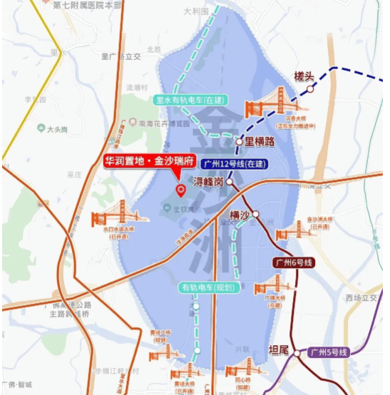 地铁6号线可直达荔湾、越秀等核心城区,换乘其他线路可覆盖天河、海珠等区域,满足日常通勤需求;地铁12号线目前已通车运营,进一步提升区域交通便捷度。自驾出行方面,项目周边环绕金沙洲大桥、大坦沙大桥、沉香大桥(在建)、同心桥(在建)、水道口大桥、黄岐大桥、丰岗大桥、碧江大桥(规划中)等多条桥梁,构建起四通八达的陆路交通网络。