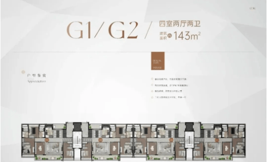 从在售楼栋来看,叠墅产品中D3栋、D4栋、D11栋、D12栋已售罄,目前主推D9栋、D10栋、D15栋、D16栋4层叠院,均为一梯一户设计,层高3.3米,保障居住私密性与舒适度。小高层洋房方面,G1栋、G2栋、G3栋及G4栋(样板间所在楼栋)持续在售,其中G4栋为17层,4梯4户布局,户型建面141㎡,客厅东北向、主卧西南向,采光通风条件优越。项目整体去化态势良好,稀缺湖山资源加持下,成为改善型购房者的重点关注对象。
