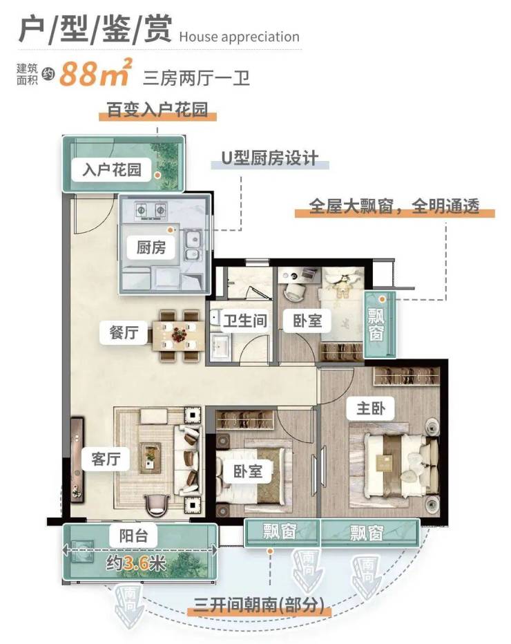 如果您对居住舒适度有更高的要求,那么建面约 88㎡的三房户型将是您的不二之选。这个户型在 77㎡的基础上进行了全面的升级,最大的亮点是三开间朝南(部分户型)。