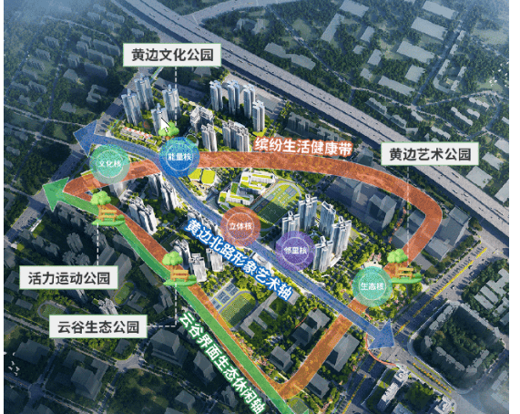 生态环境同样出色,项目紧邻黄边艺术公园(建设中),未来还将与黄边文化公园、活力运动公园(规划中)、云谷生态公园(规划中)四大主题公园串联。其中黄边艺术公园以莫奈画作为灵感,规划约 2.6 万㎡空间,包含 3 大莫奈主题花园、约 4000㎡阳光草坪、约 300m 中轴视野通廊;活力运动公园将配置乒乓球、羽毛球、篮球等运动场所,让居民在繁华都市中也能享受自然与运动的乐趣。社区内部还打造了双层游廊式泛会所、5 大主题架空层、星级车库以及含健身房、瑜伽馆、恒温泳池的会所,全方位提升居住舒适度。