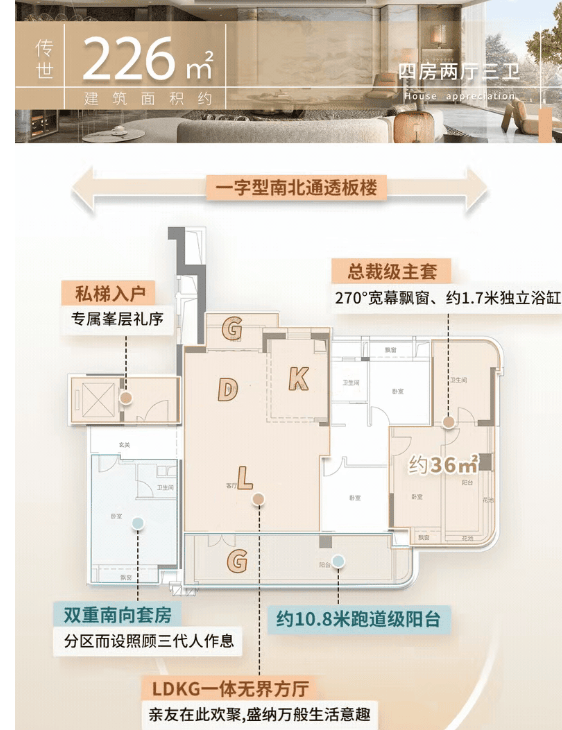 以建面约 128㎡四房为例,拥有步入式独立玄关,客厅约 5.3 米宽,搭配约 8 米宽的弧形阳台,主卧还设有 270° 弧形转角飘窗,兼具采光与观景效果;建面约 173㎡四房双套间采用 LDKG+X 设计,配置中西双厨与独立中岛台,主卧面积约 31㎡,还带有约 1.5 米独立浴缸;建面约 226㎡私梯入户板式四房为两梯两户设计,拥有 LDKG+X 超级聚厅、约 10.8 米跑道级阳台,四个卧室中双重南向套房分区设置,满足三代同堂的居住需求。全屋采用国际一线奢装交付,并配备华为鸿蒙智能系统,如 AI 超感跌倒监测、门窗智能电控系统等,提升居住的智能化与安全性。