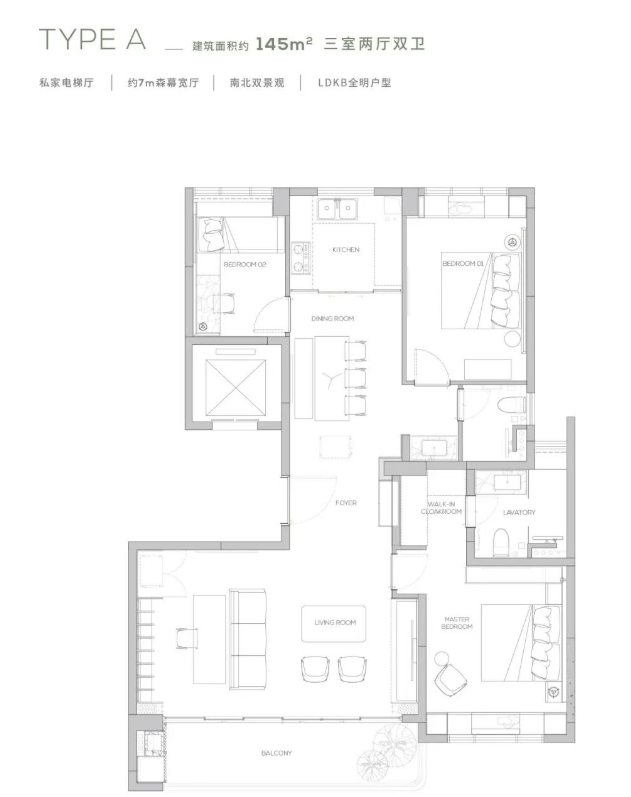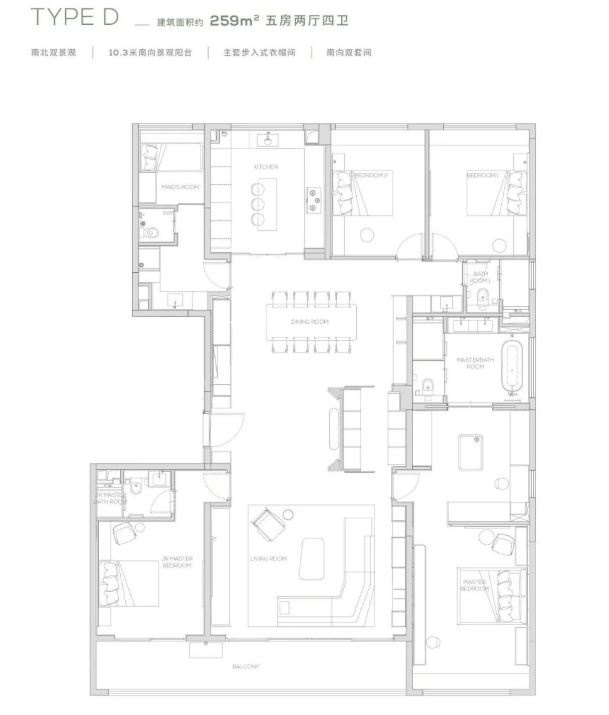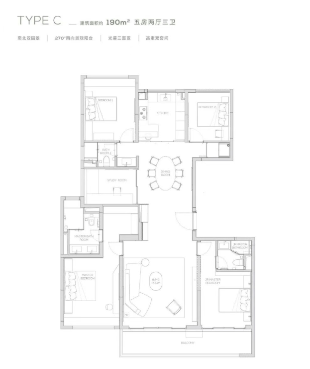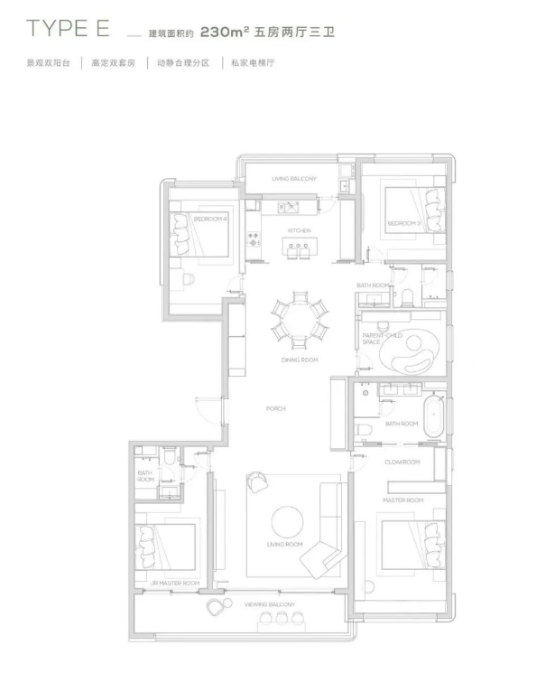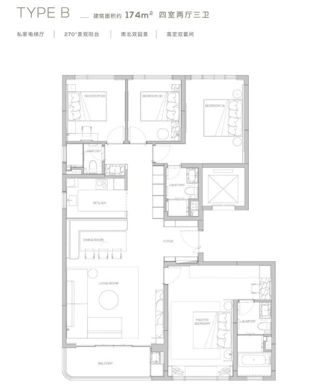 所有楼栋均为16-17层的纯板式小高层设计,采用专梯专户的形式,确保住户享有高度隐私和舒适度。外立面采用了轻质铝板幕墙搭配云翼曲线造型,美观大方且具有很强的辨识度。弧形阳台的设计不仅保留了完整的观景面,还能让住户享受到270°环幕包裹的视野。在售户型主要为168平方米的四叶草户型,该户型包含四室两厅三卫,采用了M+科技系统,注重绿色健康与智能生活的结合。