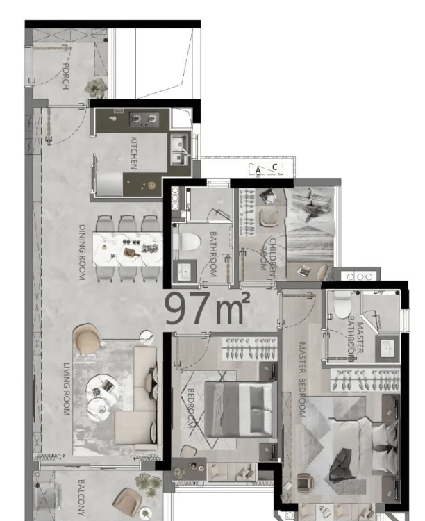 A: 项目主打97-140㎡全龄段户型,得房率在83%-85%之间,涵盖三房至四房,带入户花园、N+1空间等。