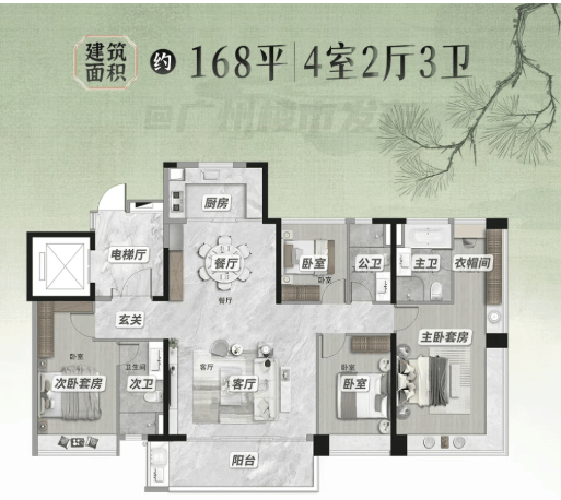 这两个面积段基本覆盖了花都主流改善客群的需求。尤其168㎡户型,采用一梯一户设计,电梯直接入户,私密性极强,还做到双主卧套间+十字厅布局,在区域内实属稀缺。