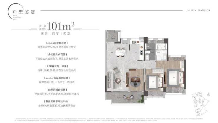101㎡三房二厅二卫:紧凑实用的设计,适合小家庭或年轻夫妇居住,布局合理,空间利用率高。