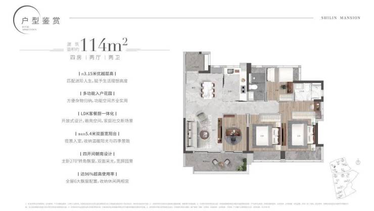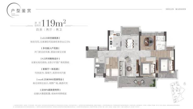 114㎡/119㎡四房二厅二卫:适合追求更大居住空间的家庭,功能分区明确,动静分离,保证了生活的私密性和舒适度。
